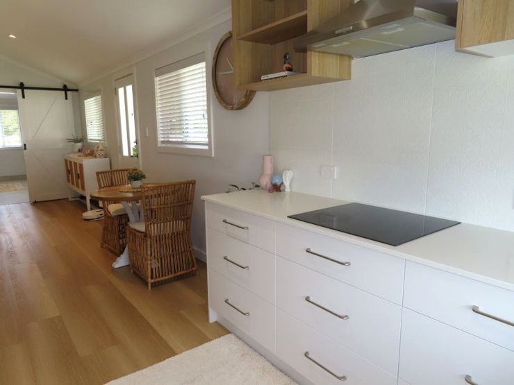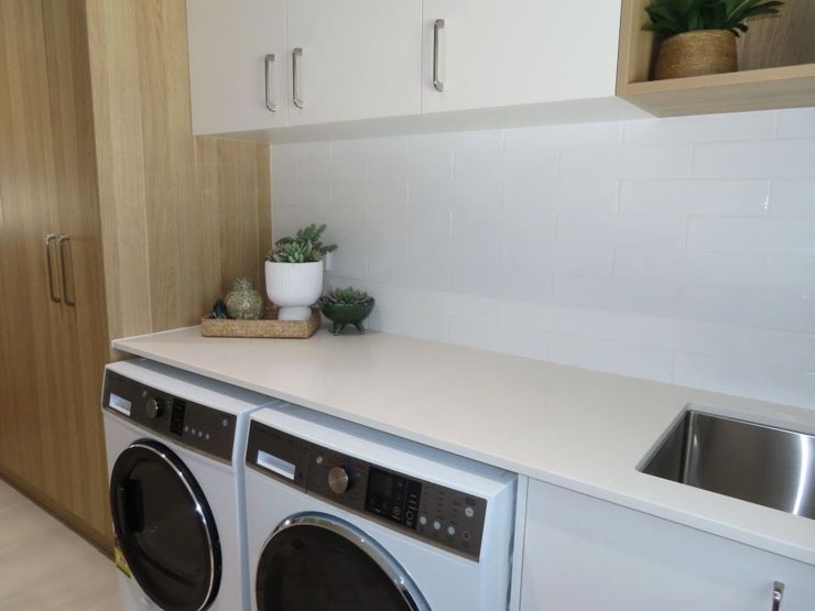 The pristine kitchen, complete with a butler's pantry, is a pleasure to spend time in and features extensive pantry shelving, a dishwasher, soft-close drawers, an induction cooktop, and pyro-clean oven. The bathroom is incorporated into a spacious laundry with ample storage.